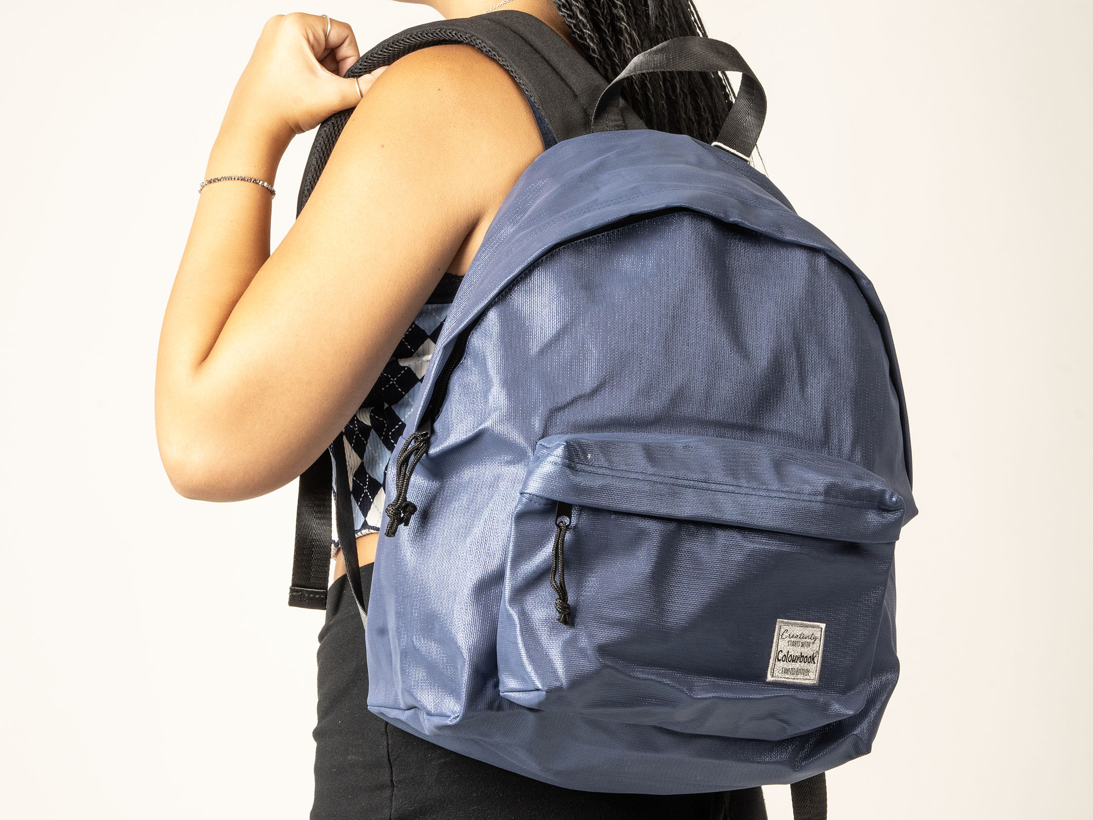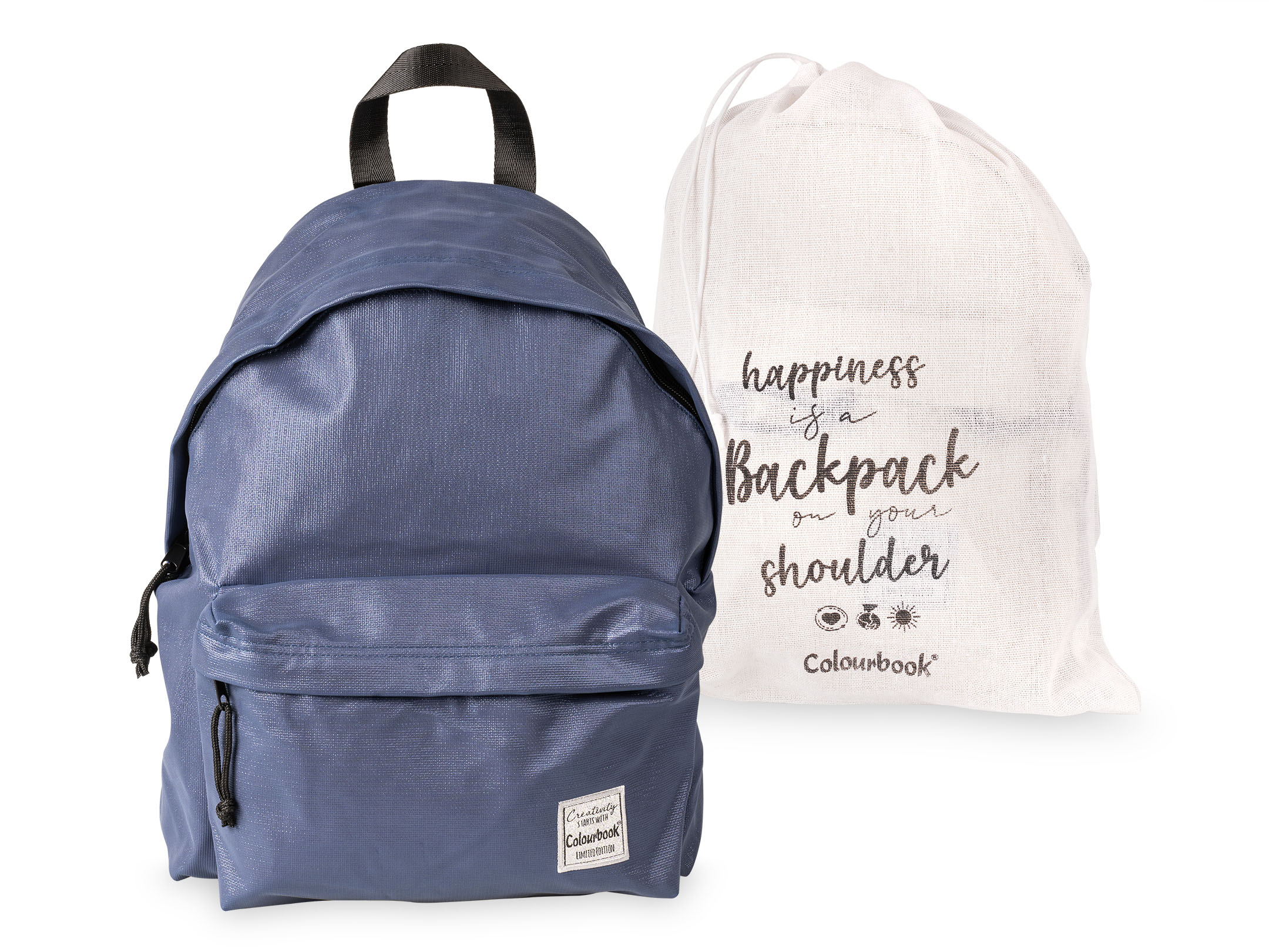 Lo zaino è molto capiente ha i tirazip in nero ed etichetta Colourbook in argento apposta sulla pratica tasca anteriore che ti permette di tenere sotto mano gli oggetti più importanti.
