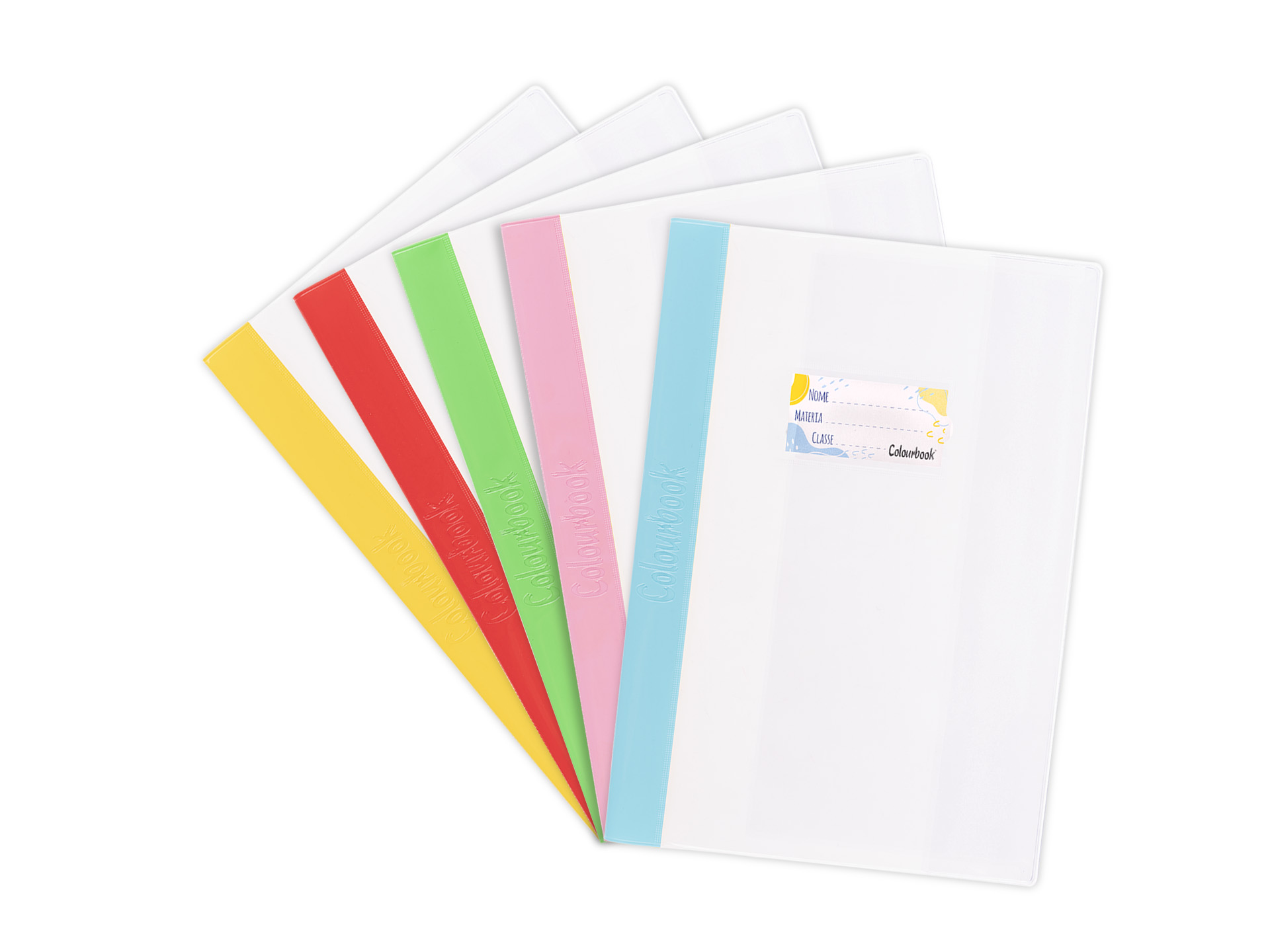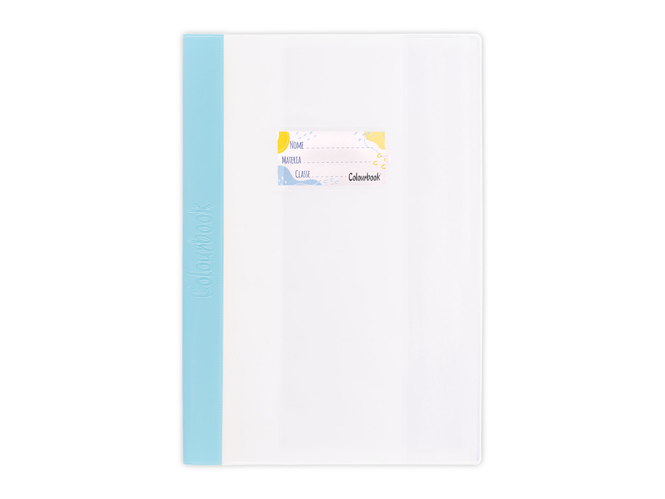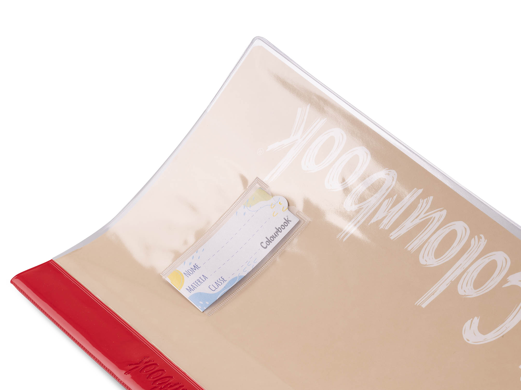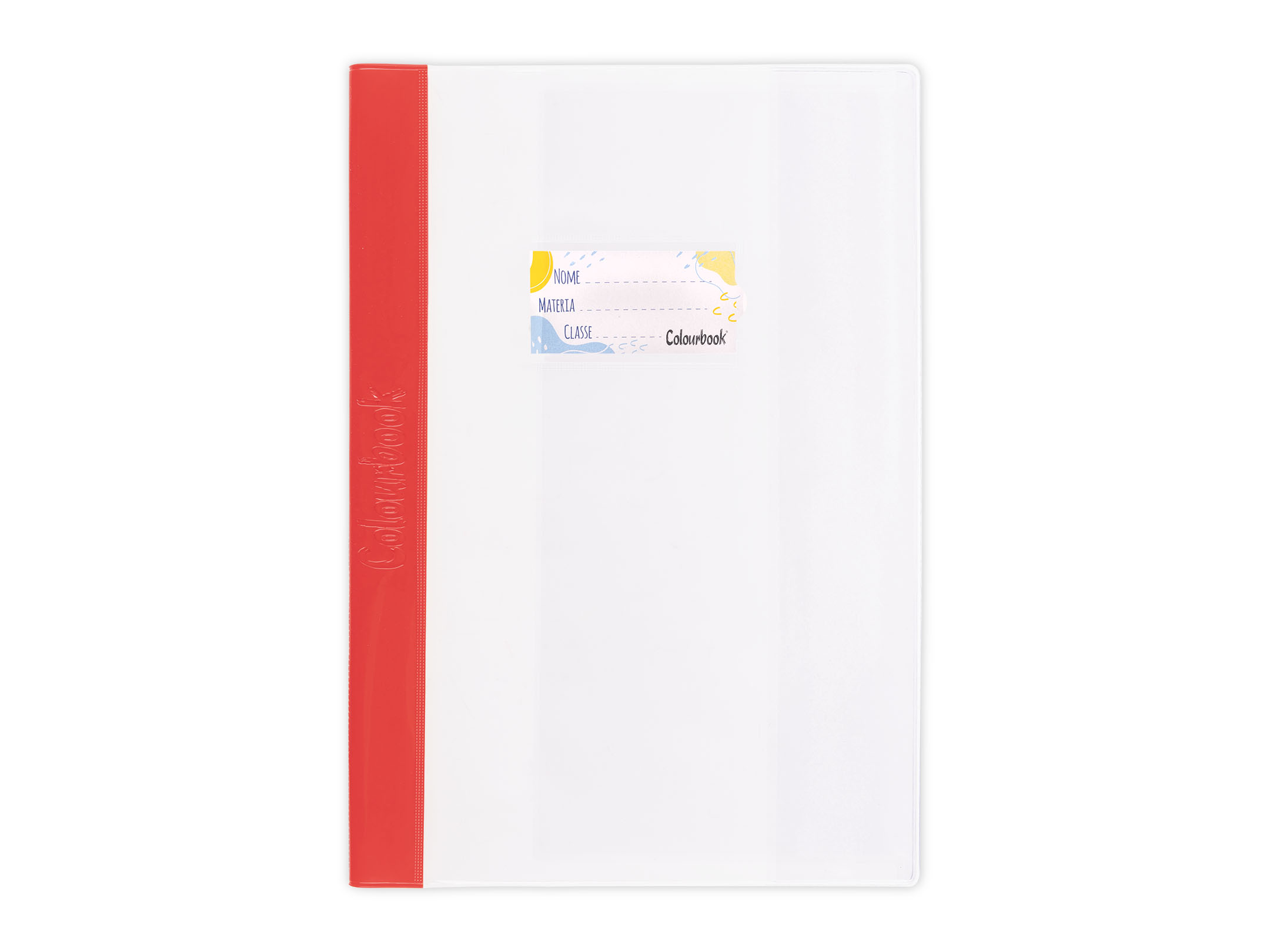 Set 5 copriquaderni maxi trasparente con banda colorata sul dorso ed etichetta per il nome.