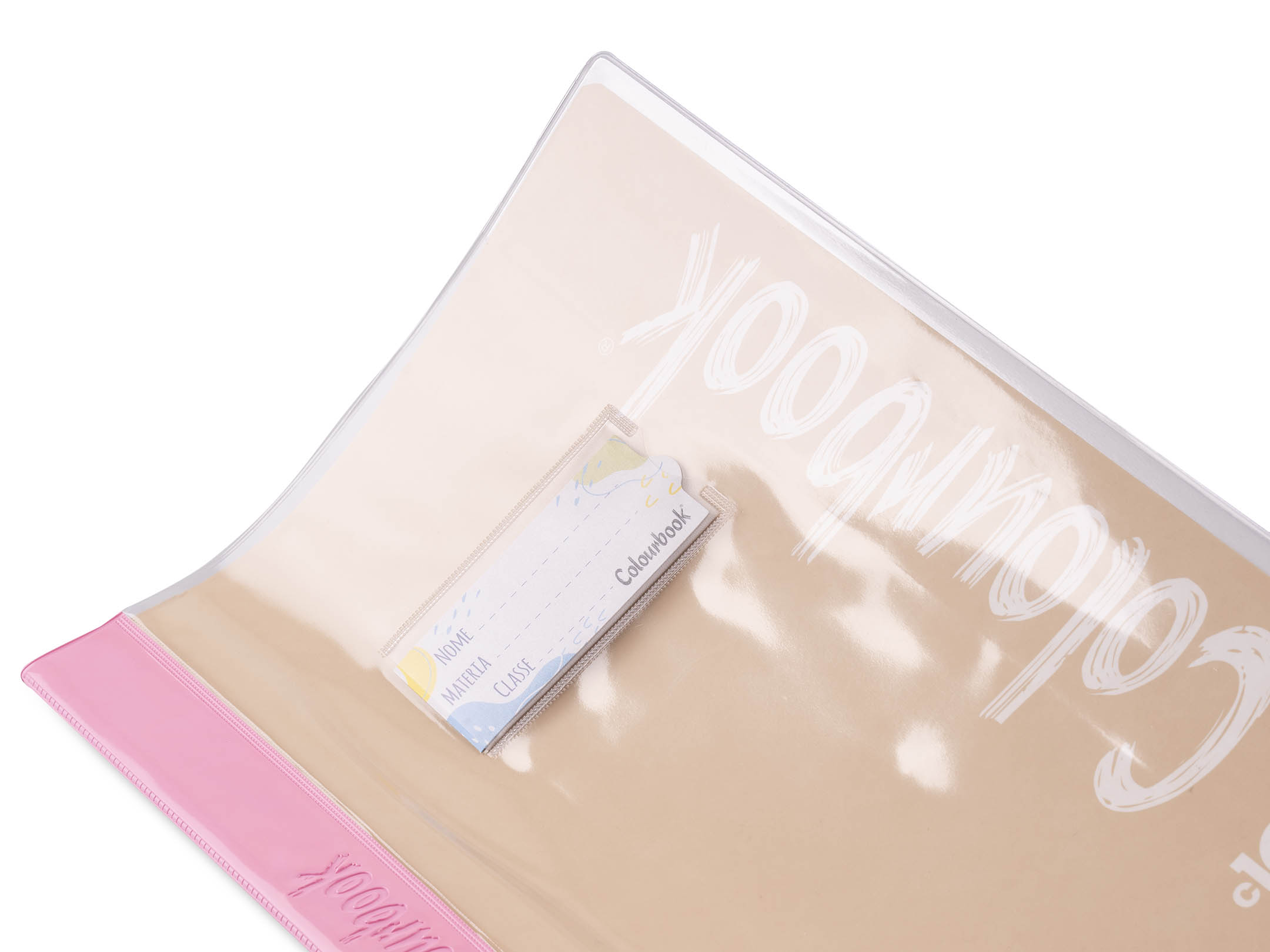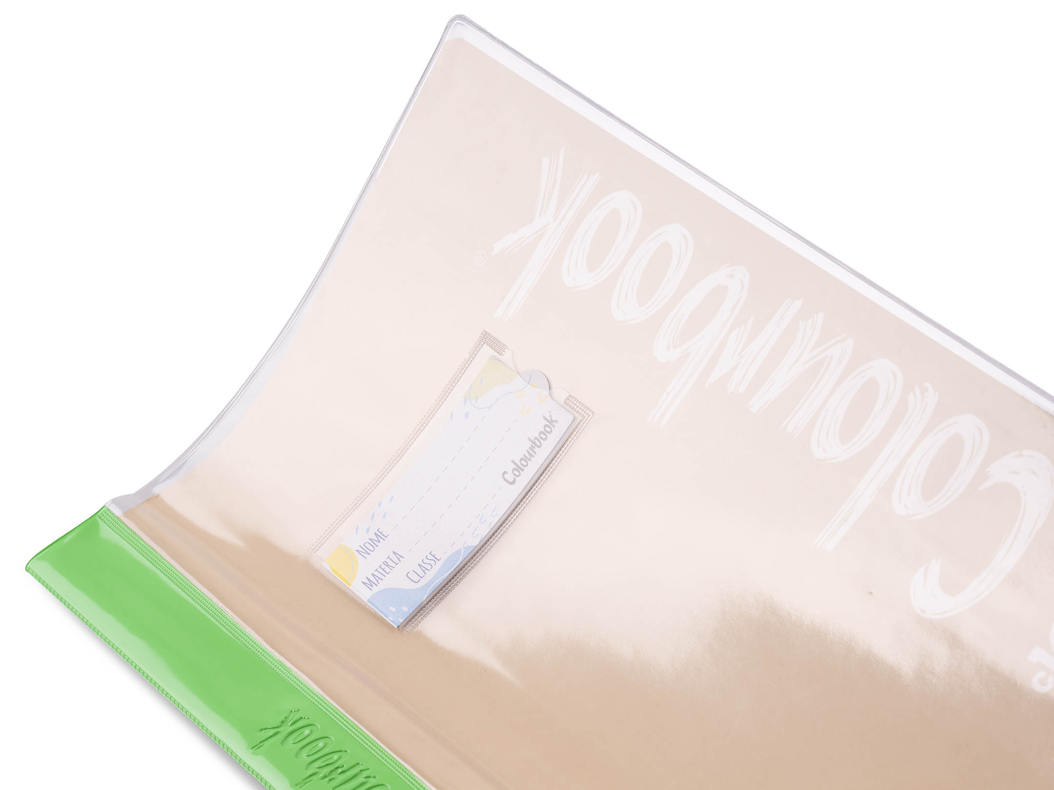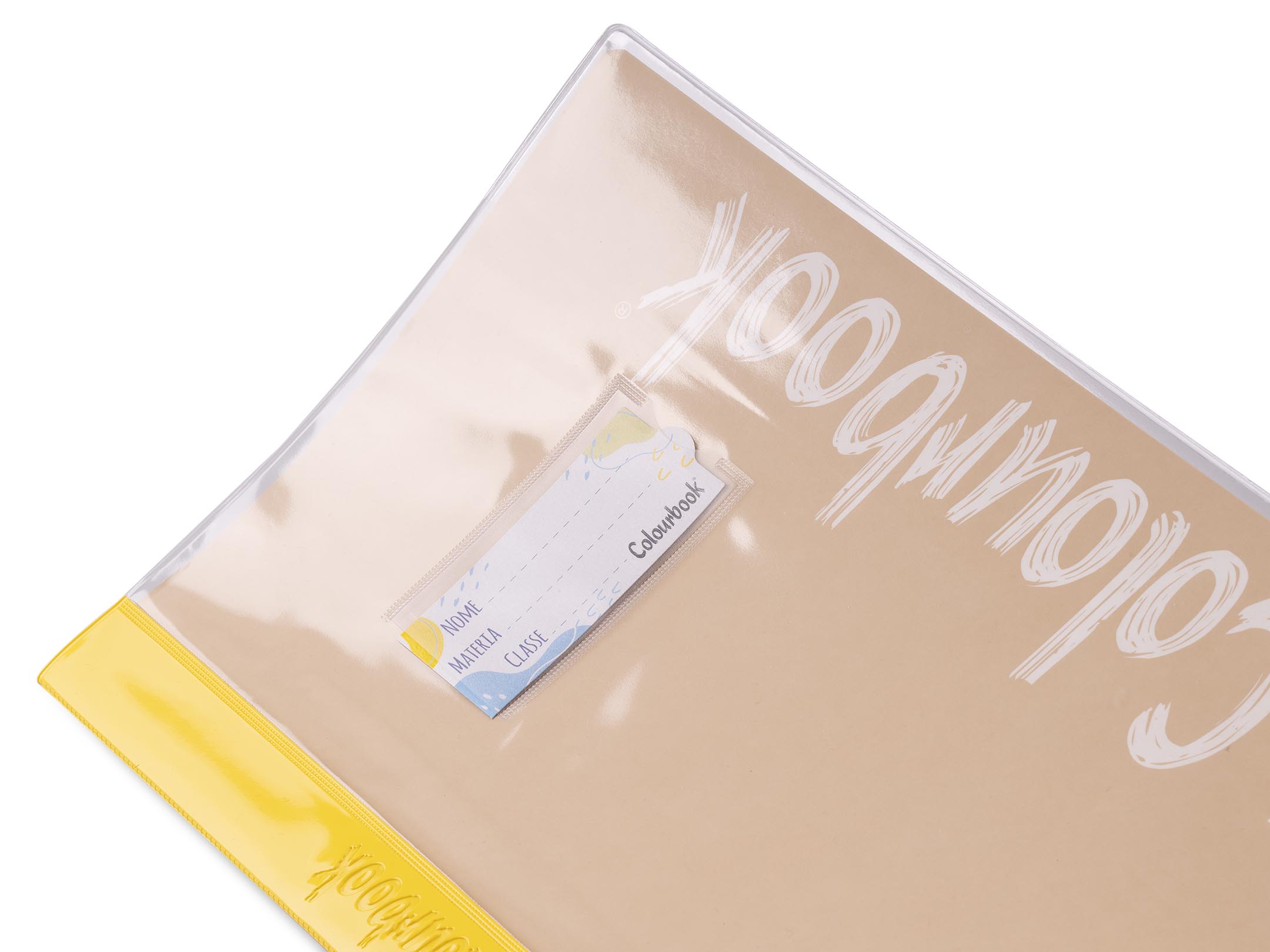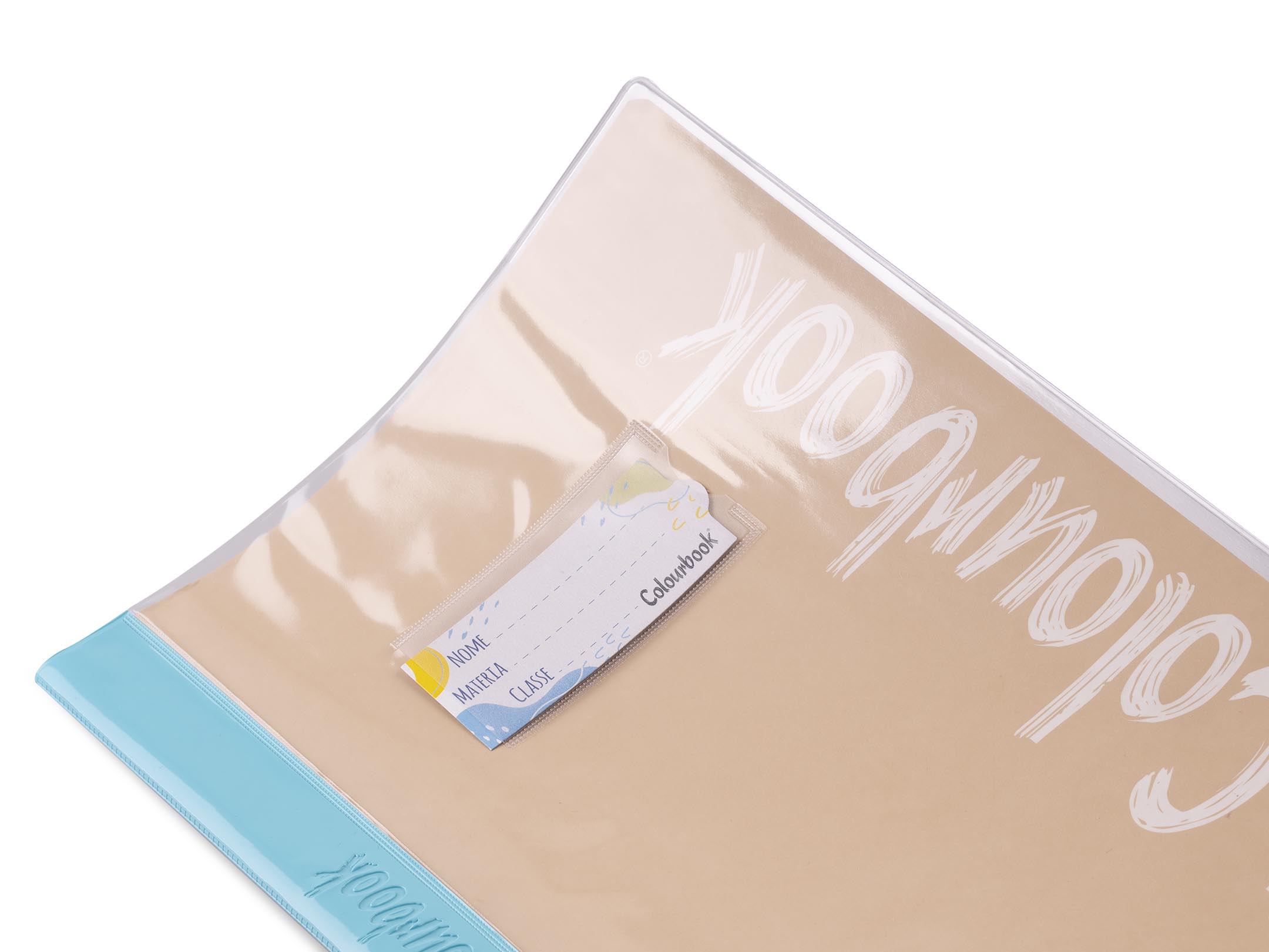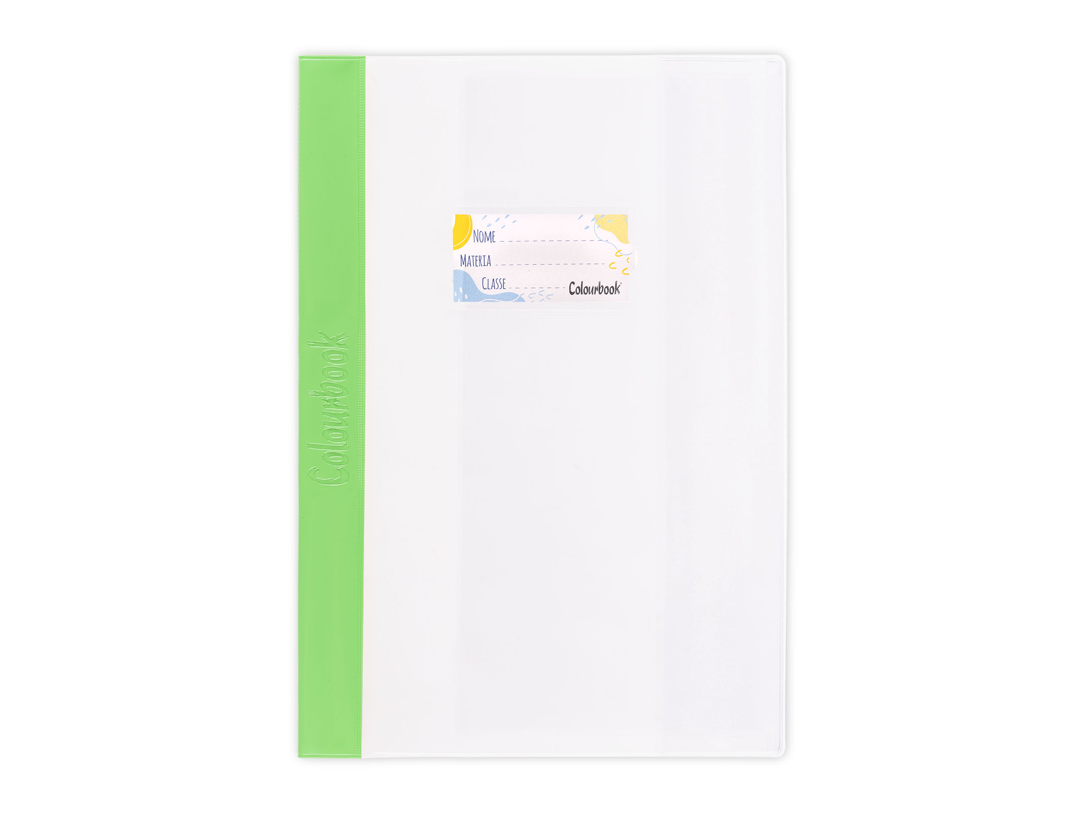 Set 5 copriquaderni maxi trasparente con banda colorata sul dorso ed etichetta per il nome.