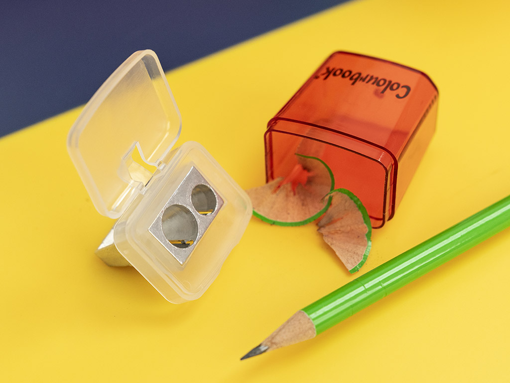 Temperamatite colorato in metallo e plastica con 2 fori e un capiente contenitore, un accessorio 2 in 1 da portare sempre con sé!