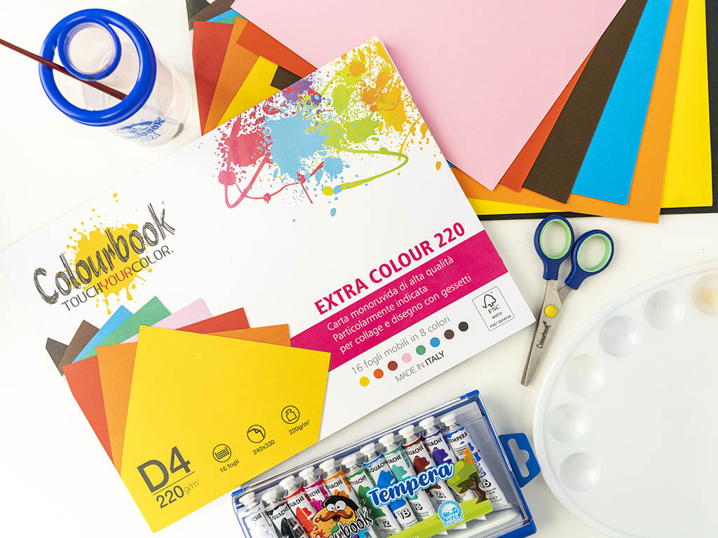 16 fogli mono ruvidi in 8 colori vivaci: giallo, arancione, rosso, rosa, verde, azzurro, marrone e nero.