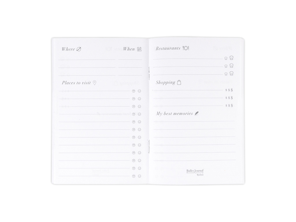 Gli inserti disponibili per il Bullet Journal Modimò sono composti da 32 fogli e vengono inseriti all'interno di una copertina in polipropilene, grazie al pratico gioco di elastici nel dorso, con colori a contrasto. Ciascun inserto comprende, sul retro, il formato White. Flessibile, creativo, intercambiabile e personalizzabile.